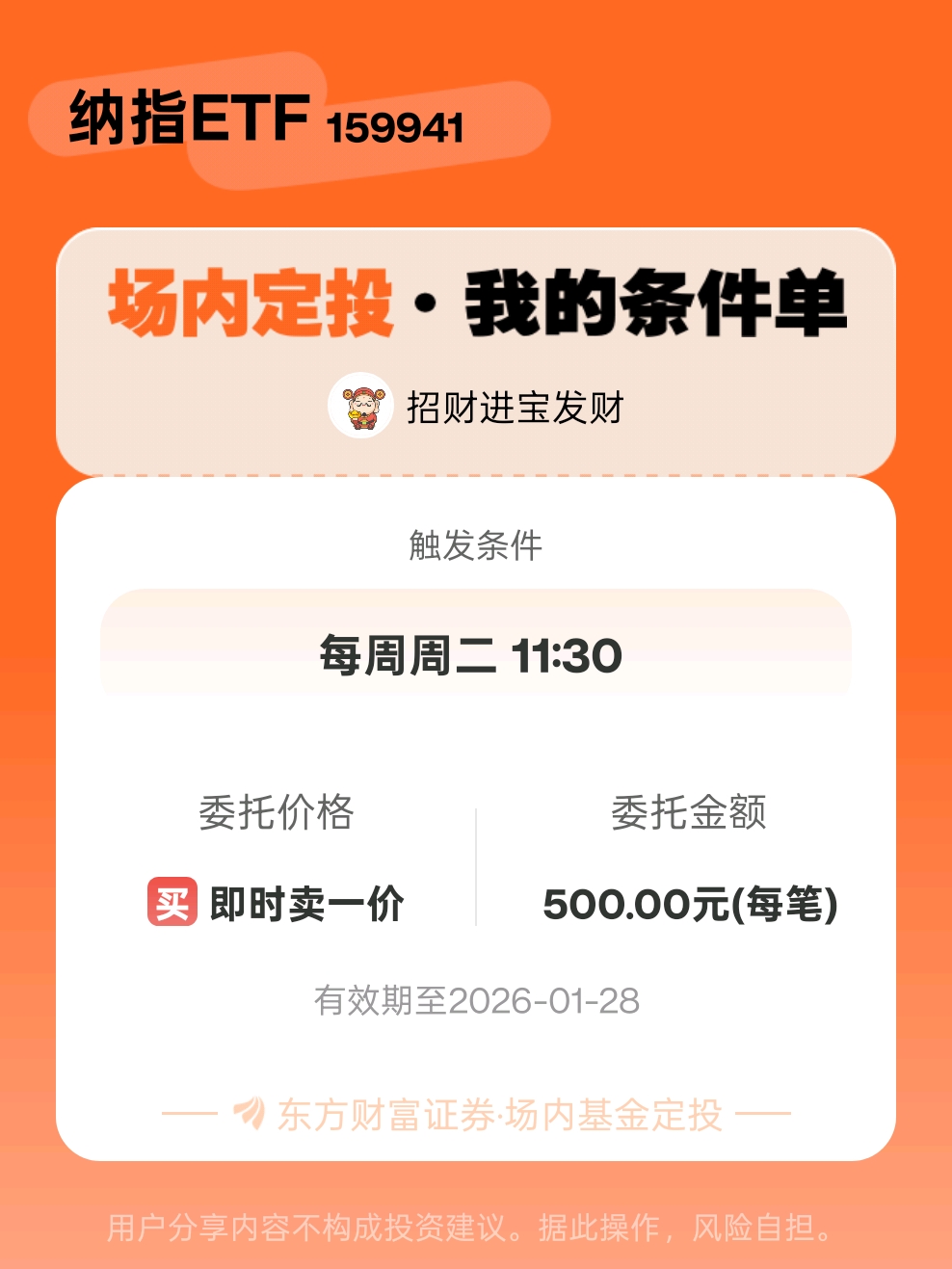 #条件单交流# #场内定投晒单# 一位股神设置了一个场内基金定投条件单,接下来就是见证奇迹的时刻~$纳指ETF(SZ159941)$