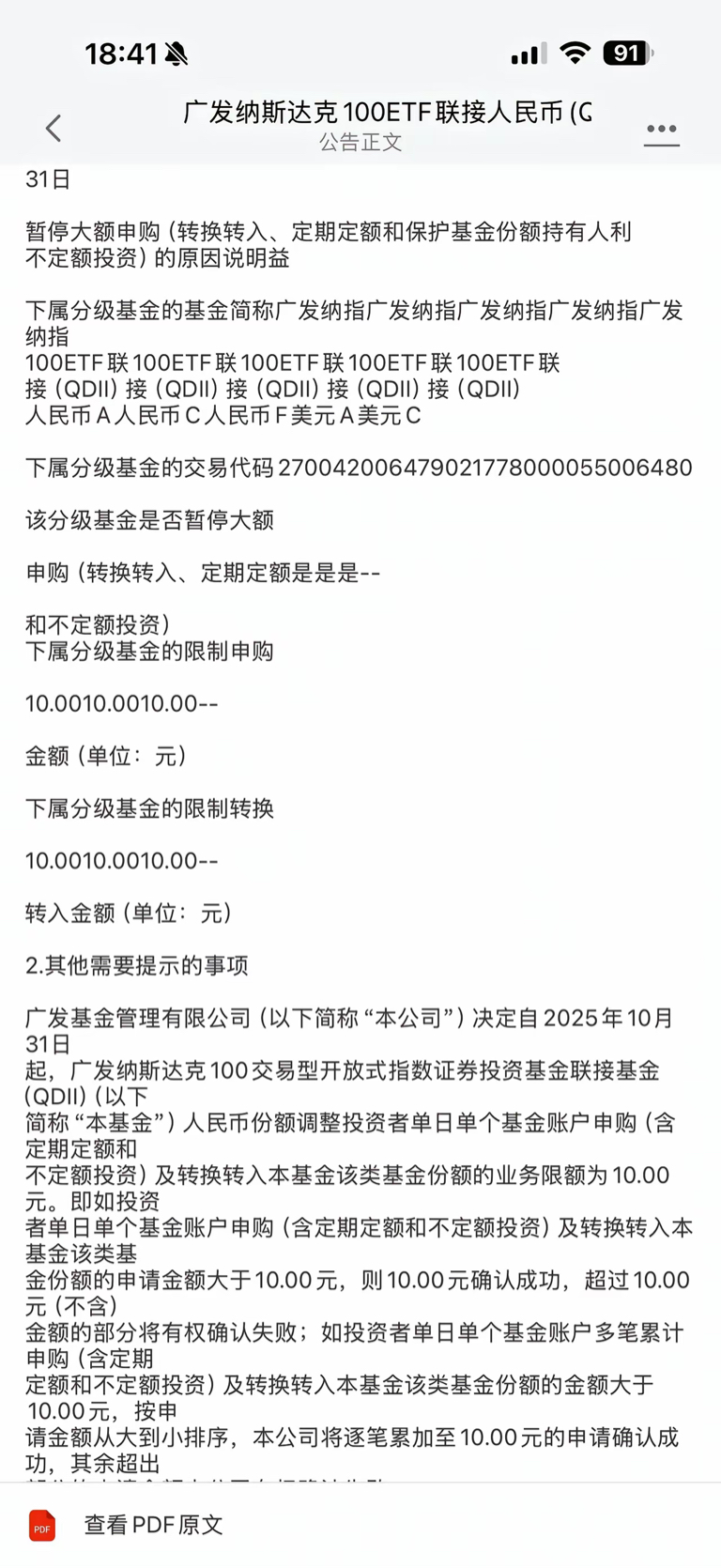 $纳指ETF(SZ159941)$ 场外限额十块钱了,难怪这么高溢价