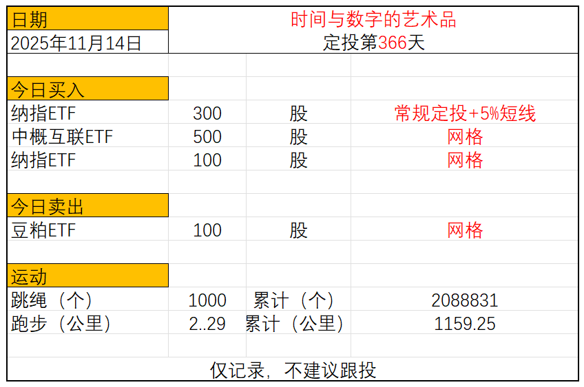 运动与投资第366天2025年11月14日今日定投:纳指ETF买入300股中概互