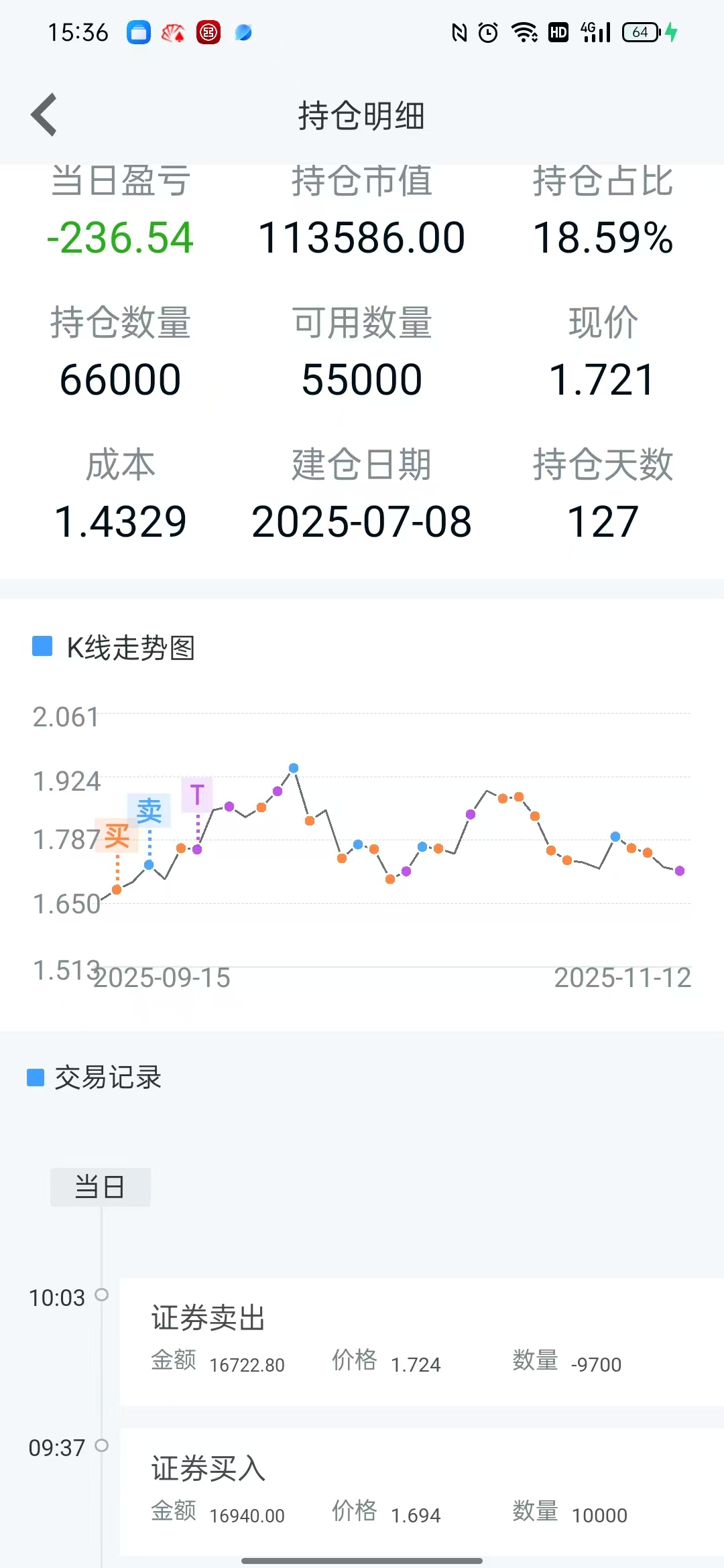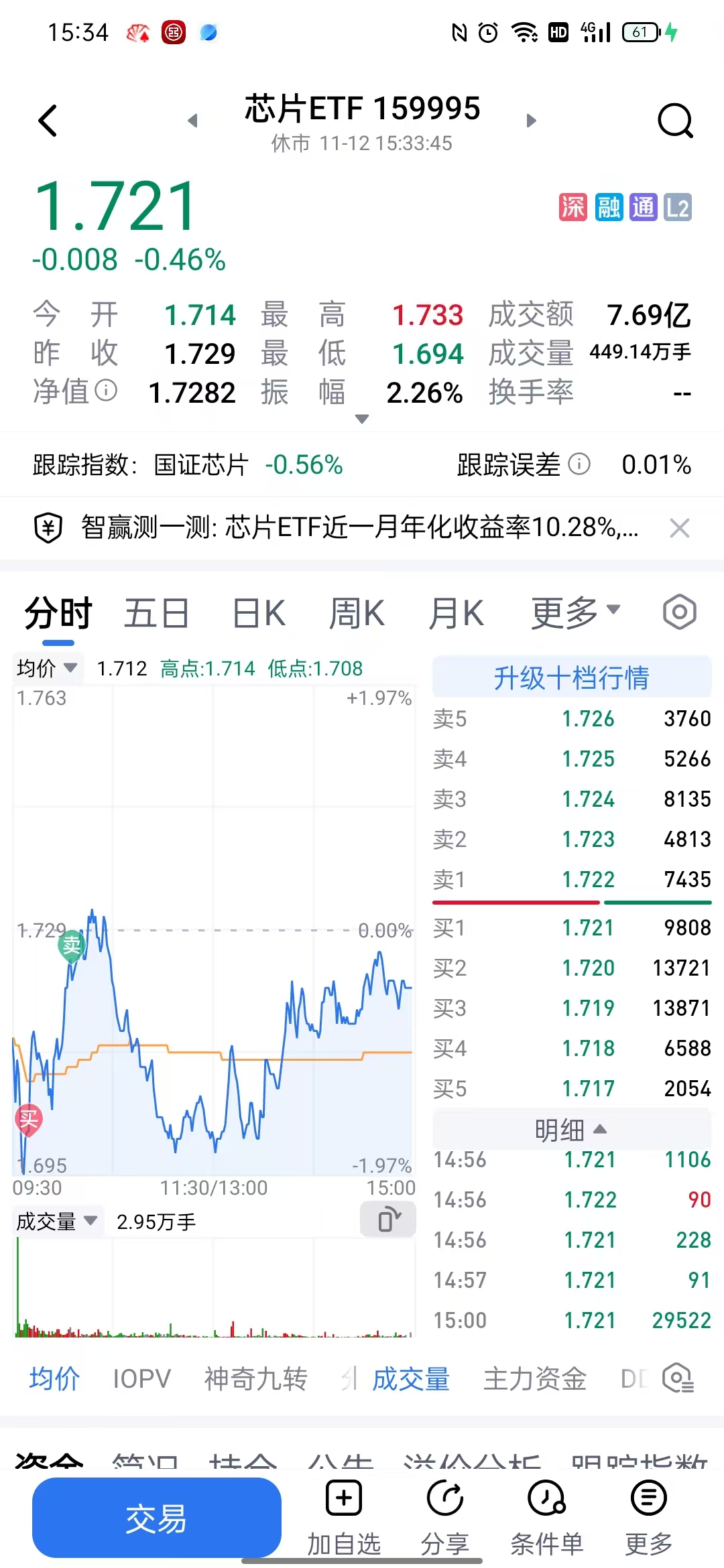今天芯片ETF1.694的最低点被我抄了一万股!