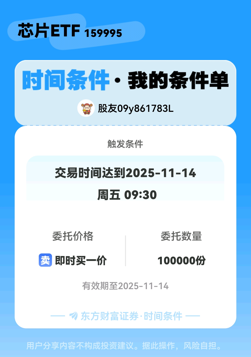 #条件单交流# #时间条件晒单# 一位股神设置了一个时间条件条件单,接下来就是见证奇迹的时刻~$芯片ETF(SZ159995)$