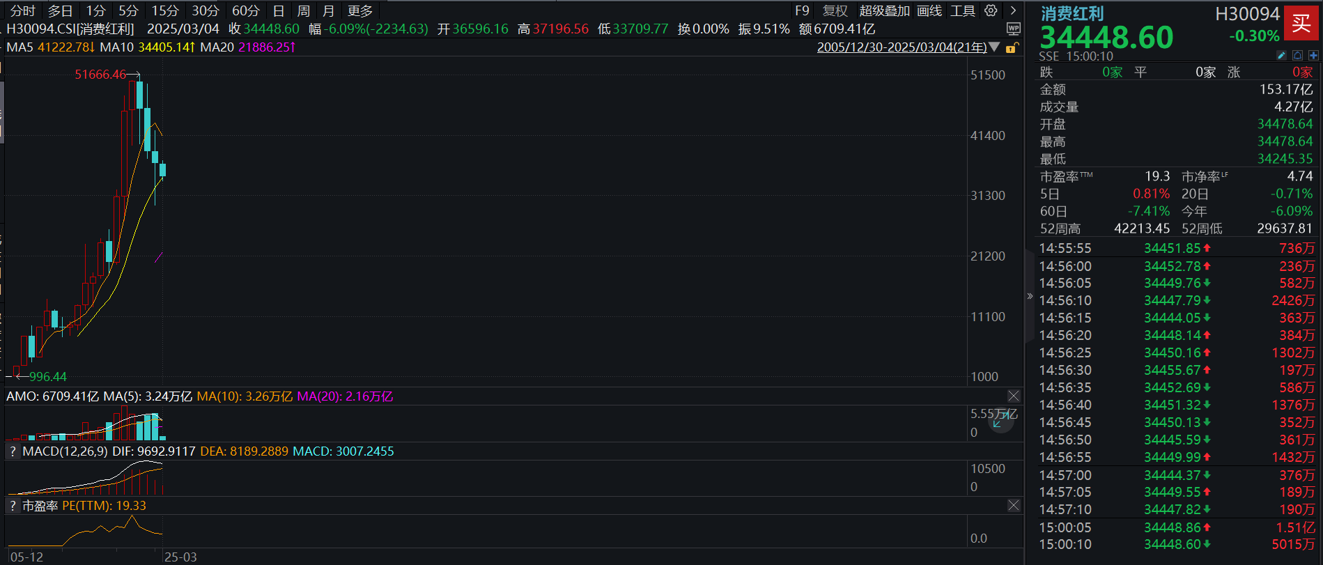 如果算上今年的话,已经是4年连跌了,这在历史上是比较少见的(消费红利(H30094.CSI)2022年涨跌幅:-9.27%,2023年涨跌幅:-15.62%;2024年涨跌幅:-5.11%,2025年截至3月4日涨跌幅:-6.09%,Wind,2022.01.01-2025.03.04)。