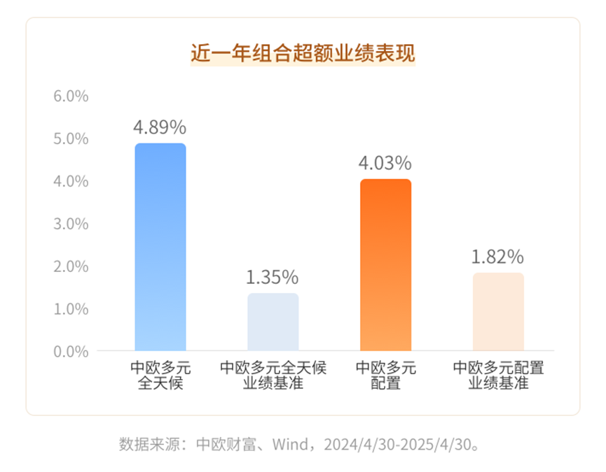 那我们多元组合的夏普比表现如何呢?成立以来,中欧多元配置的夏普比为1.83,业绩基准夏普比为0.88;中欧多元全天候的夏普比为1.80,业绩基准夏普比为0.5(数据来源:Wind,2024/4/30-2025/4/30)。