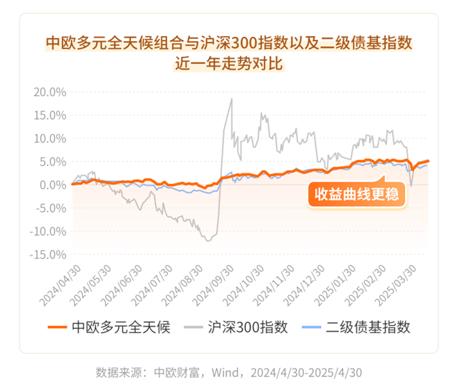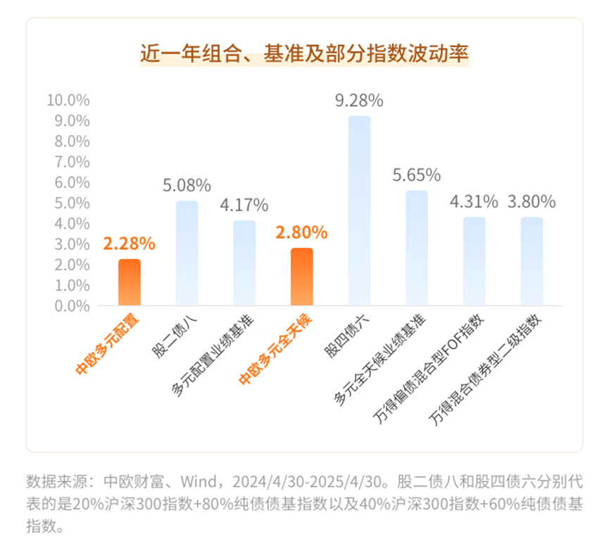 数据来源:中欧财富、Wind,2024/4/30-2025/4/30。股二债八和股四债六分别代表的是20%沪深300指数+80%纯债债基指数以及40%沪深300指数+60%纯债债基指数。
