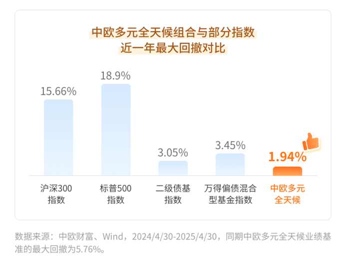 数据来源:Wind、中欧财富。中欧多元全天候成立于2024年4月30日,截至2025年4月30日,组合及同期业绩比较基准成立以来涨跌幅为4.89%/1.35%。中欧多元全天候的业绩基准为7%*中证800指数+16%*南华商品指数+9%*MSCI全球指数+65%*纯债债基指数+3%*货币基金指数。中欧多元配置成立于2024年4月30日,截至2025年4月30日,组合及同期业绩比较基准成立以来涨跌幅为4.03%/1.82%。中欧多元配置的业绩基准为5%*中证800指数+11%*南华商品指数+6%*MSCI全球指数+75%*纯债债基指数+3%*货币基金指数。过往业绩不预示其未来表现,为其他客户创造的收益并不构成业绩表现的保证。