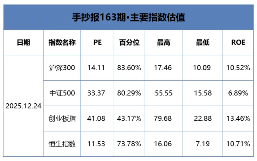 风雨同舟又一年,开年的第一期手抄报,我们提出不以前几个交易日的表现定全年,要抛弃熊市思维,有序出牌,积极有为。2025年还剩下3个交易日,沪深300上涨18%,偏股型基金指数上涨近30%,手抄报系数从10到6,投资实证从浮亏到全面盈利,市场情绪曾一度升至较热……回顾这一年,期盼新一年,我们年年相伴,相向而行!