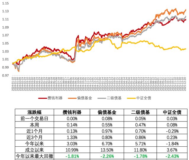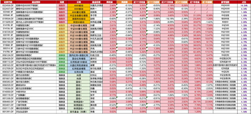 攒钱利器这边,上周红利风格占优,跑出一些优势。但这周风格切换,所以相对平庸,这周小涨了0.14%。成长单边大涨环境下,攒钱利器红利固收+的结构,往往会逆风一些。收益会跑的比较慢一点。但这个市场最终还是盈亏同源的逻辑。成长风格下牺牲的弹性,会在市场下跌,风格逆转时,回补成更强的防御属性。所以当下这种环境,如果觉得股市涨的比较高,心里没底,风险承受力不太高,但又想参与一些收益,获得比债券更高的回报。想取个折中策略的话,其实攒钱利器还是不错的选择。尤其最近红利比较逆风,今年也没怎么涨的状态下,那么对比成长,其实风险就会小很多。攒钱利器也类似于足球场上后腰的属性,进攻能力不突出,但也能参与一些进攻战术。而一旦局势转攻为守,它的作用会更为凸显。