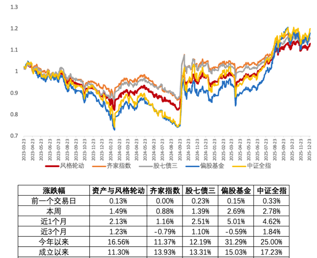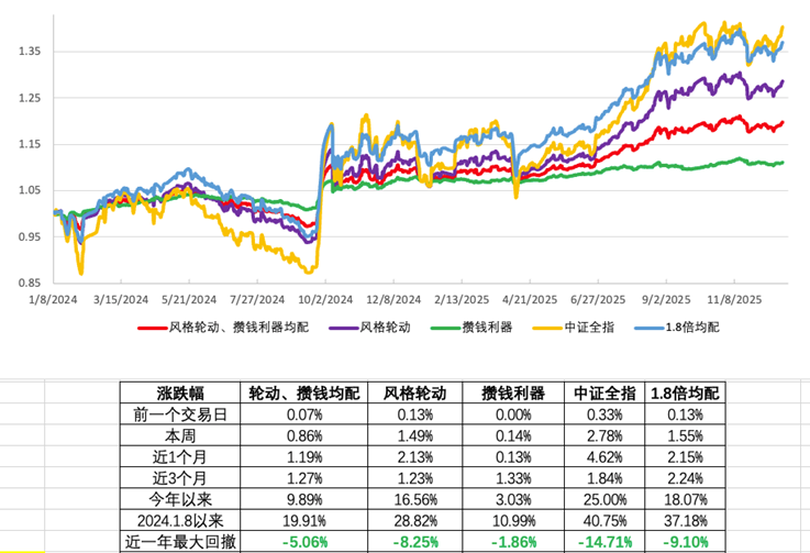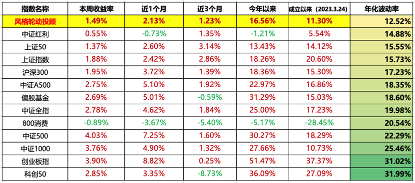 这周市场风格又发生了反转切换,上周价值强,成长弱。这周风险偏好明显回升,小盘和成长反弹,红利价值反而收跌。成长单边上涨环境下,风格轮动一半的防守仓位,自然就跟不上涨幅了,不过这周也收涨了1.49%,大体跟住全指5成多的收益。今年还有3个交易日收盘,目前风格轮动,今年以来的成绩是16.56%,牛市大涨环境下,基本跟住了市场7成涨幅。但波动率只有市场的一半多点。在今年风格多变的环境下,应该能让大家拿的更安心一些。风险收益性价比还算可以。下期投顾陪伴,我们也会对投顾做个年终盘点。