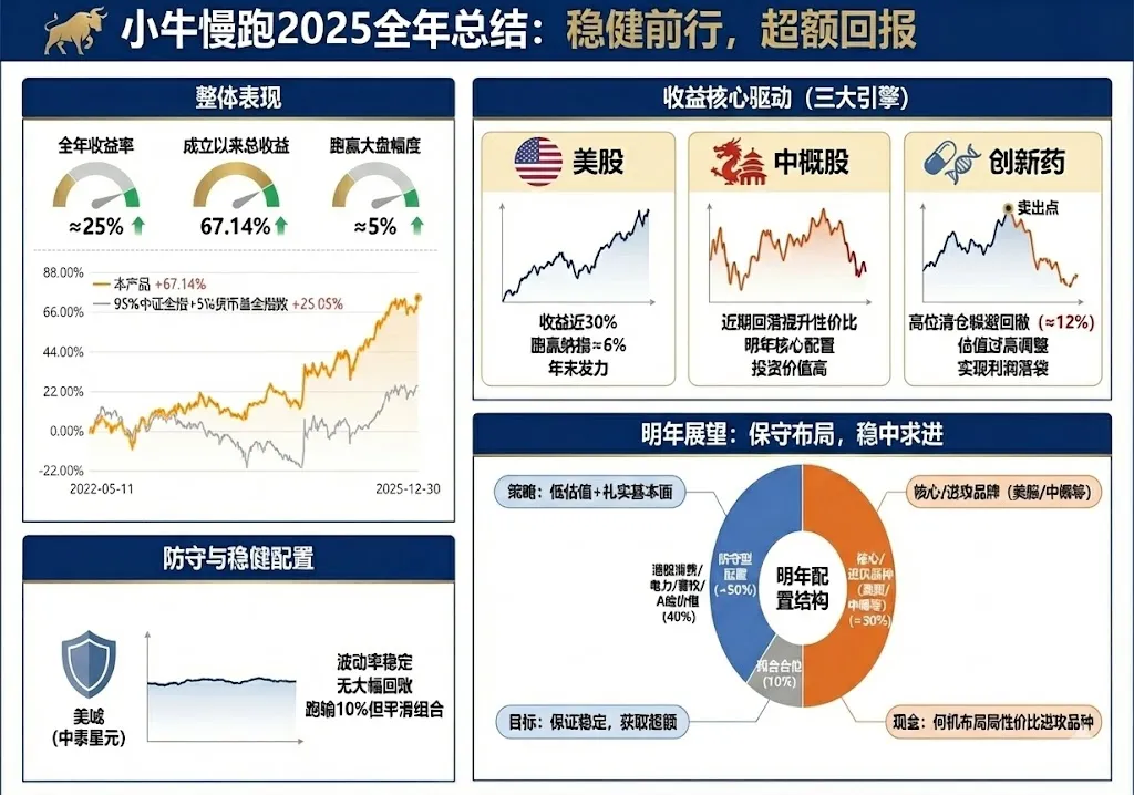 在复盘里,没有对未来的预测,更多是原则性的思考:为什么坚持不做“相对收益攀比”?为什么在 9 月市场明显过热时果断暂停申购?为什么配置绝对收益类资产能帮助组合走得更稳?这些都写得非常透彻。