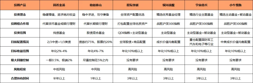 目前我们的基金投顾组合已经有六个,分别是银河战舰、宇宙奇兵、星际穿越、小牛慢跑、稳如泰山和固若金汤,详细配置逻辑以及目标人群点击图片查看