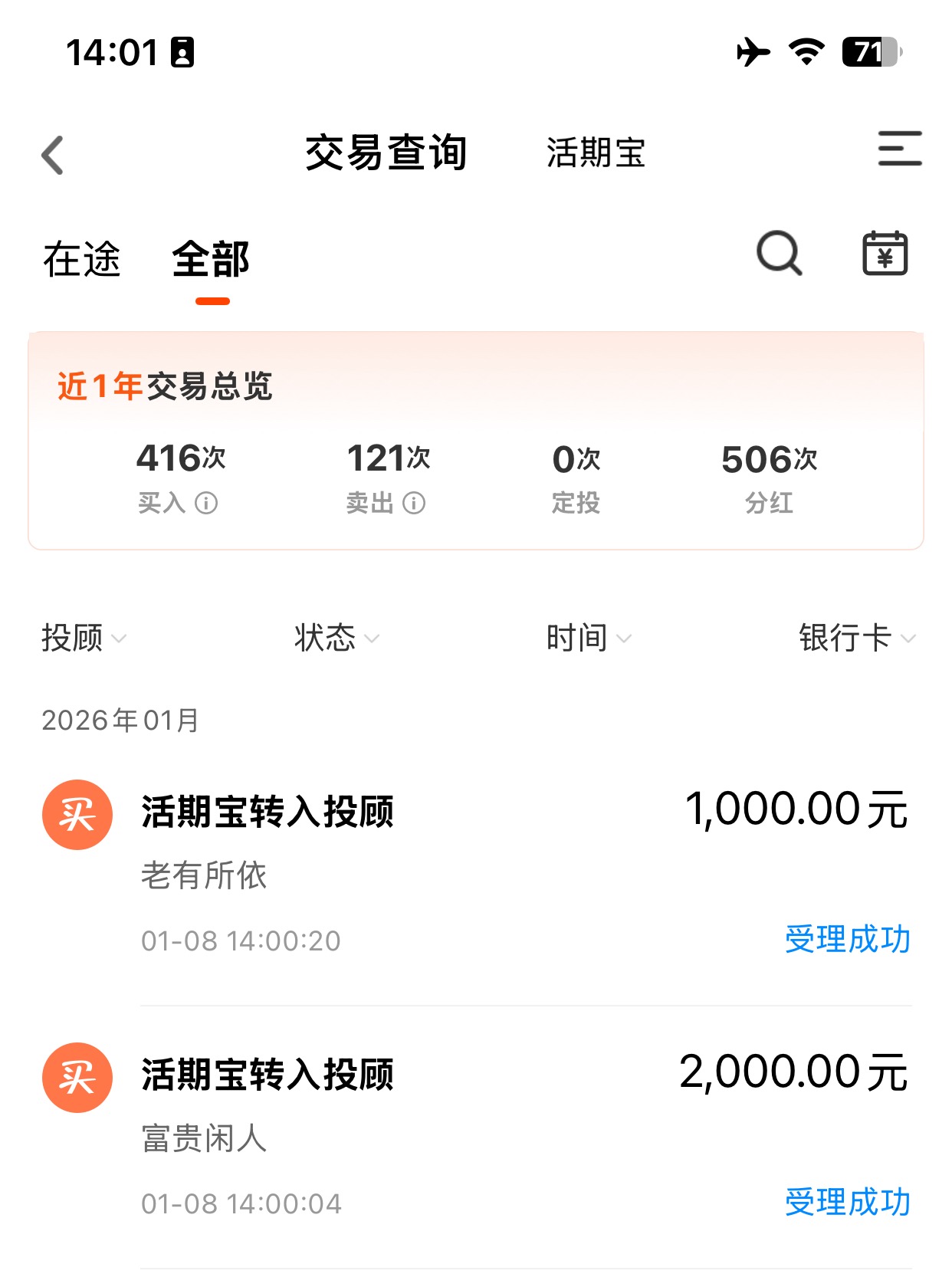 今天跟车2000元富贵闲人,跟车1000元老有所依。今天额外跟车两个基金投顾组合,趁着市场回调提升仓位,这两个基金投顾开年连涨3天,涨幅不错,今年预计会有很不错的表现。