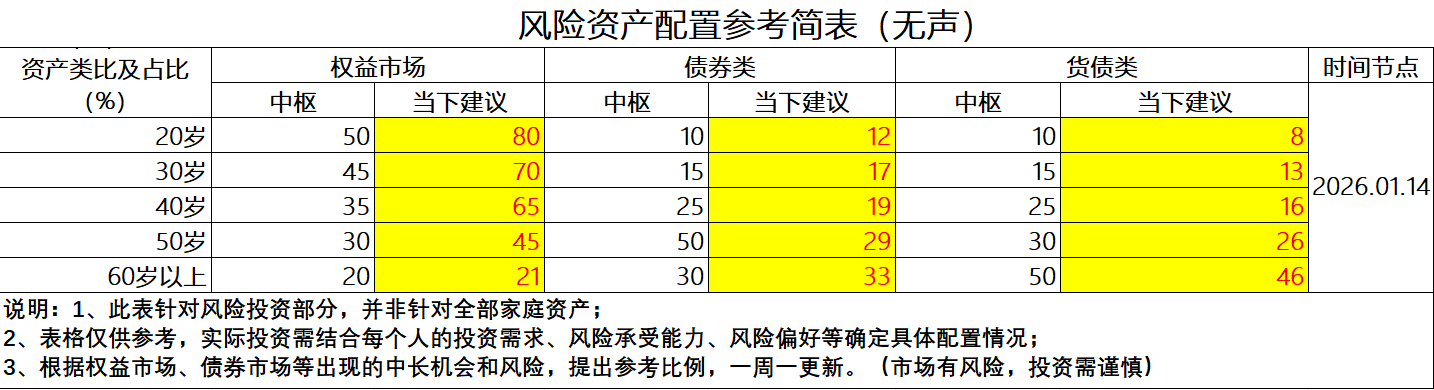 可以参考上表,根据自己的实际情况,好好的规划好,在当下这个时点,有多少闲钱可以用了做风险投资,在成长、红利、债券、货币这4个方向上,又该怎么分配不同的比例。