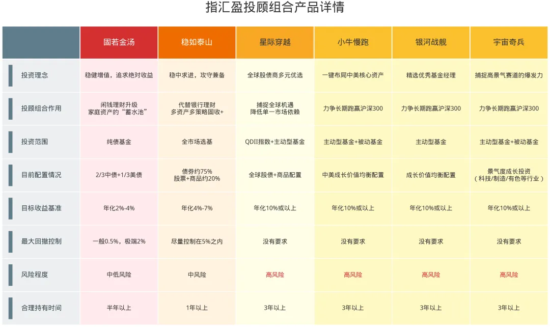 目前我们的基金投顾组合已经有六个,分别是银河战舰、宇宙奇兵、星际穿越、小牛慢跑、稳如泰山和固若金汤,详细配置逻辑以及目标人群点击图片查看