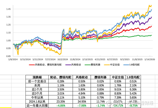 这两周政策出手降温,但其实市场情绪依旧有惯性。这周大多数宽基指数还是上涨的。不过也能够明显感受到,市场风格开始变得混乱。两股力量交锋中,大小盘这周出现分化,成长价值基本持平,但周中开始左右横跳,甚至一天一变。这种环境下做好均衡持仓,其实会非常踏实。只要不是市场集体大跌,那么不管谁涨,其实组合都能受益。比如这周红利和成长出现反复切换,一些热门板块也在剧烈抖动,但风格轮动基本稳步前行,连续5天都跑出了正收益。那么你拿着它,在这种乱世环境中,心态就会非常稳定。这周风格轮动收涨1.63%,中证全指收涨1.76%,7成仓位基本也跟上了全指涨幅。主要也是因为这周红利缓了一口气,只要风格不那么极致,不是单边大涨行情,在震荡市中,其实对配置都是非常有利的。