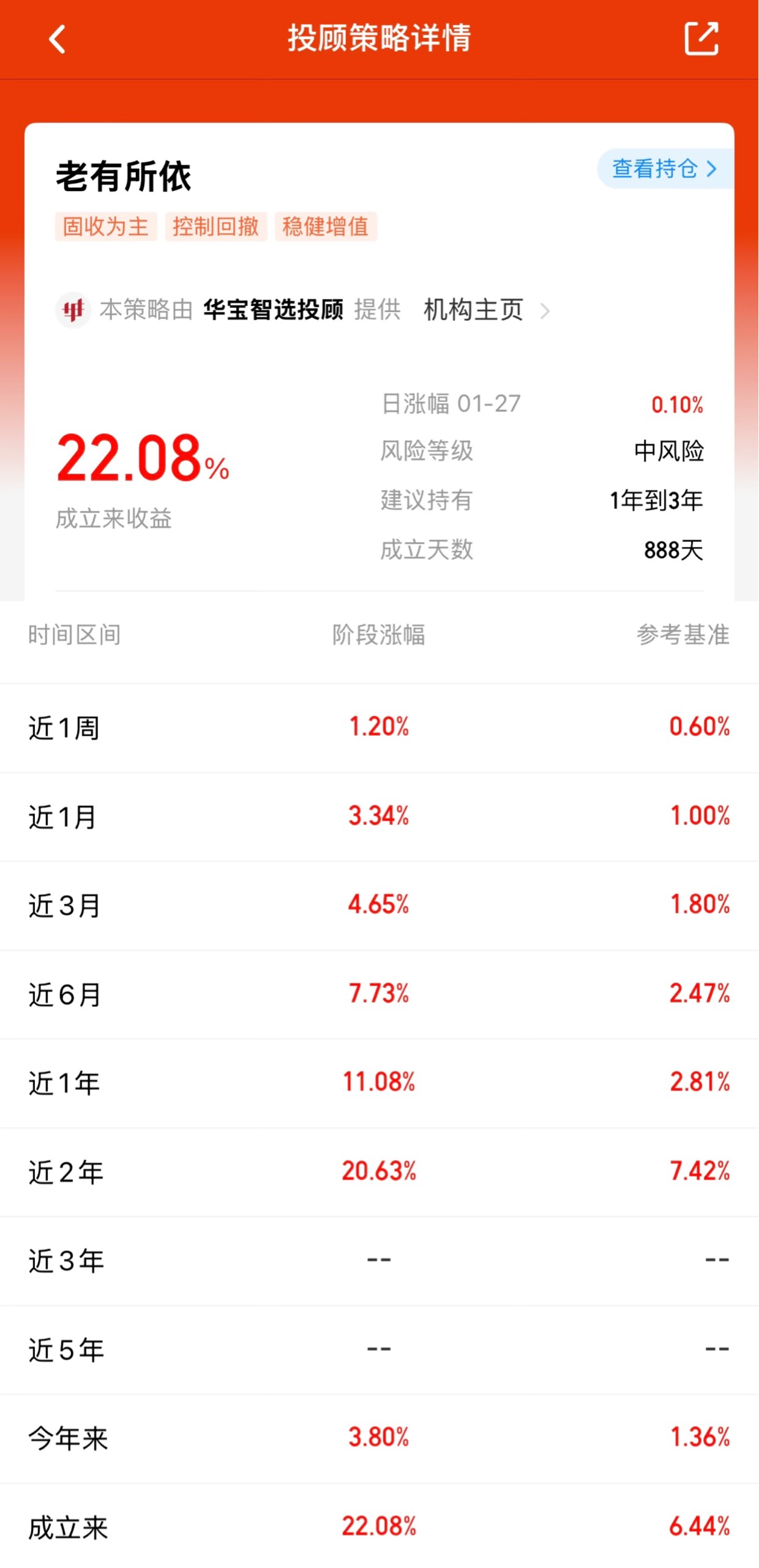 【老有所依】今日上涨0.10%,今年上涨3.80%,近一年上涨+11.08%,成立两年多年化回报8.81%,最大回撤仅1.39%。买入10万块,今日收益+100元,过去一年赚了11080元,长期持有每年平均赚8810元。