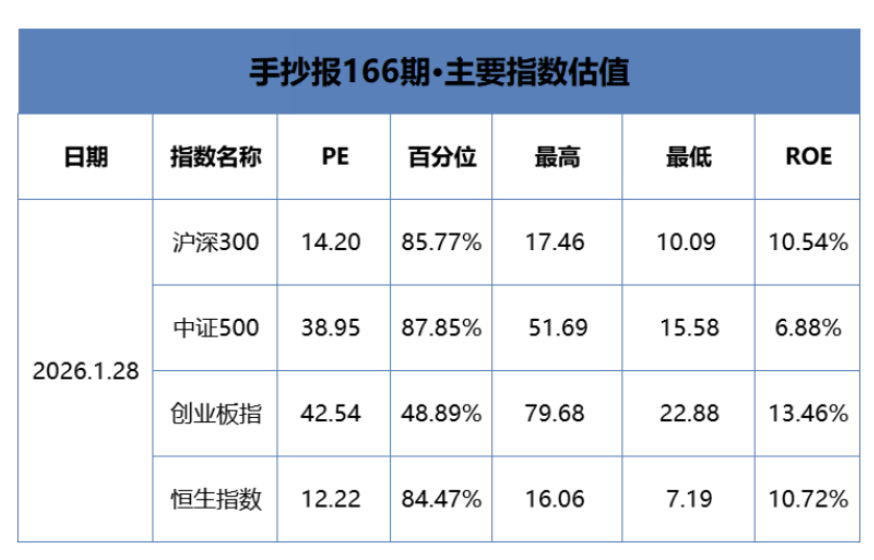 相比上期手抄报,创业板估值基本持平,其他宽基指数继续小幅升温。其中,恒生指数本周创下近4年的新高。