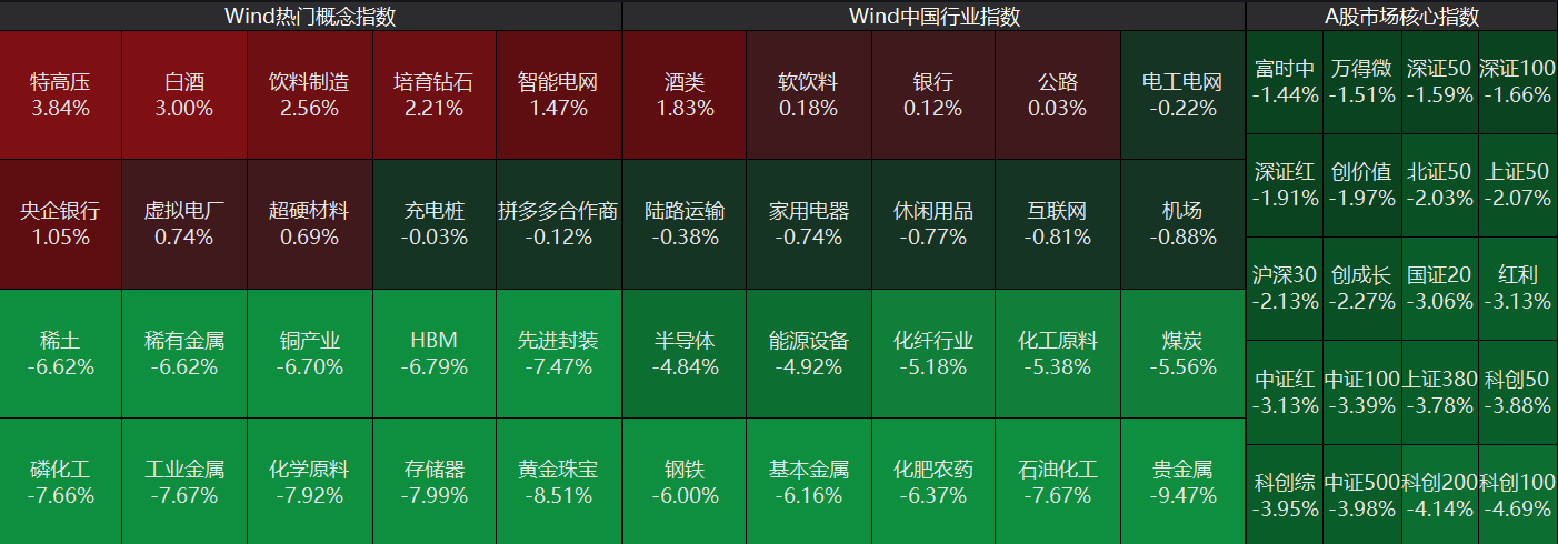 细分方向上,除了中证白酒收涨1.87%,电网设备主题收涨1.30%,中证银行收涨0.15%,我们跟踪其他的指数和方向,基本都是调整的;