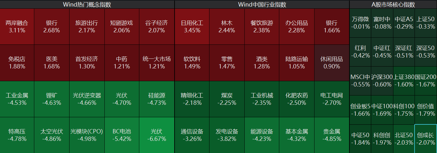 人工智能收跌2.14%,科创芯片收跌1.44%,总体走势没有资源周期那么极端,但日线级别已经走坏,如果2月份继续大幅调整,周线和月线也会走坏,需要边走边看。