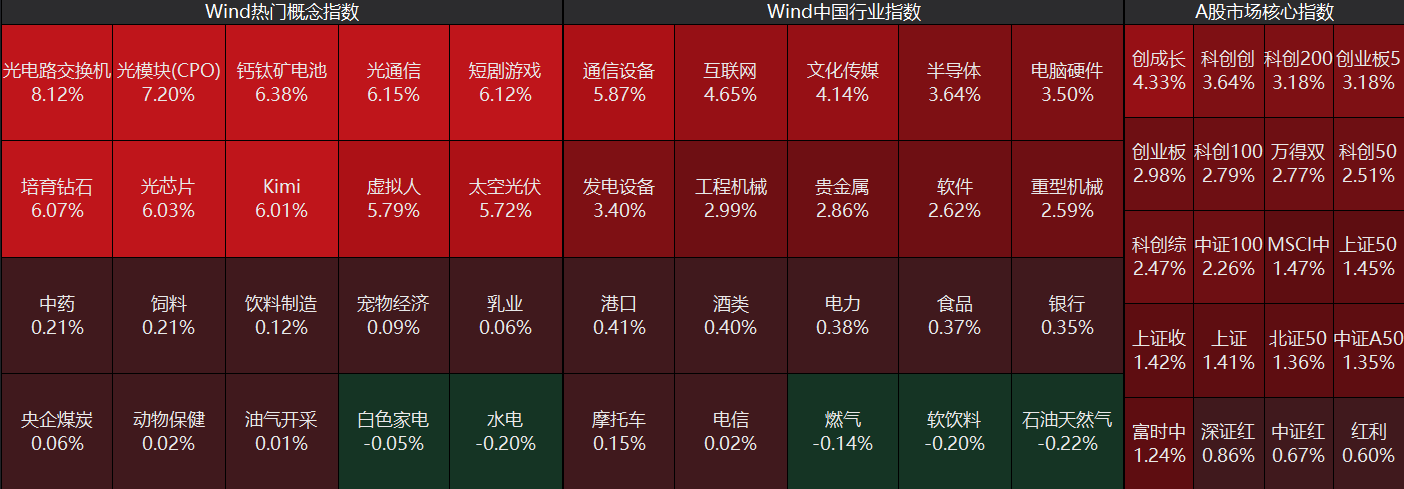 表现最好的还是人工智能板块,在几大巨头给出了增幅巨大的2026年AI支出计划之后,市场逐步修正对于整个板块的预期,全天下来,人工智能收涨3.92%,科创芯片收涨3.59%;