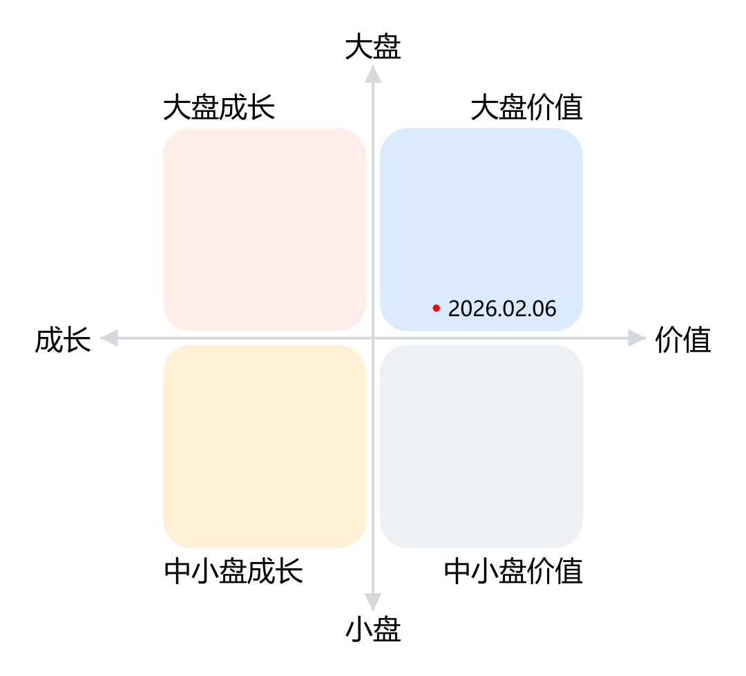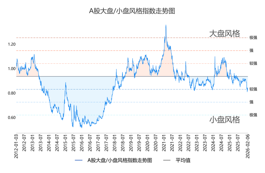 数据来源:Choice,截至2026.02.06。A股大盘/小盘风格指数计算方法:以2012年1月1日为基点,采用沪深300指数、中证1000指数涨幅,做归一化处理并计算比值。当A股大盘/小盘风格指数位于平均值之上时,市场为大盘风格;反之,当A股大盘/小盘风格指数位于平均值之下时,市场为小盘风格。
