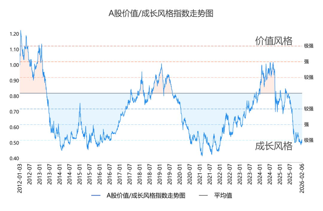 数据来源:Choice,截至2026.02.06。A股价值/成长风格指数计算方法:以2012年1月1日为基点,采用中证红利指数、创业板指数涨幅,做归一化处理并计算比值。当A股价值/成长风格指数位于平均值之上时,市场为价值风格;反之,当A股价值/成长风格指数位于平均值之下时,市场为成长风格。