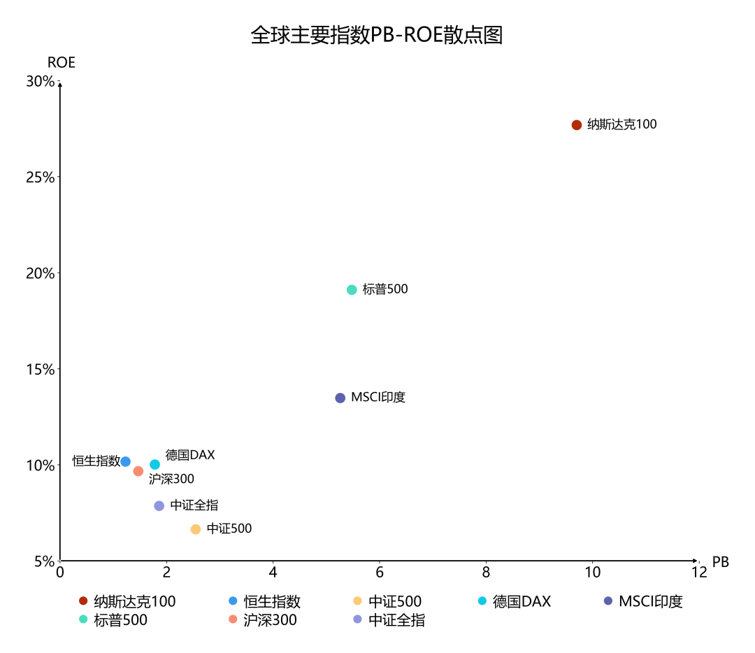 从PB-ROE散点图进行全球纵向比较可以看出,目前恒生指数、德国DAX、沪深300等指数投资性价比相对较高。