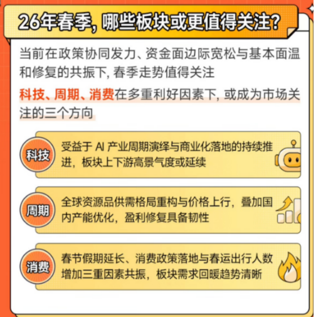 小沐刷到广发基金的春季行情宣传页,发现和自己的判断高度一致:在政策协同发力、资金面宽松与基本面修复的共振下,科技、周期、消费三大主线将成为 2026 年春季最值得关注的方向。
