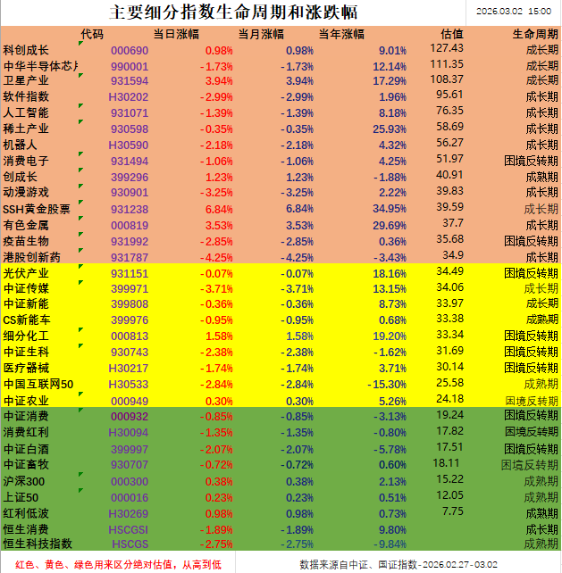 中证白酒收跌2.07%,盘中最低下探到8241.15点,创下了2021年2月份调整以来的新低(20210201-20260302),短中长期向下的趋势仍然很明显;消费红利收跌1.35%,趋势也比较被动。(以上Wind,2026.03.02)
