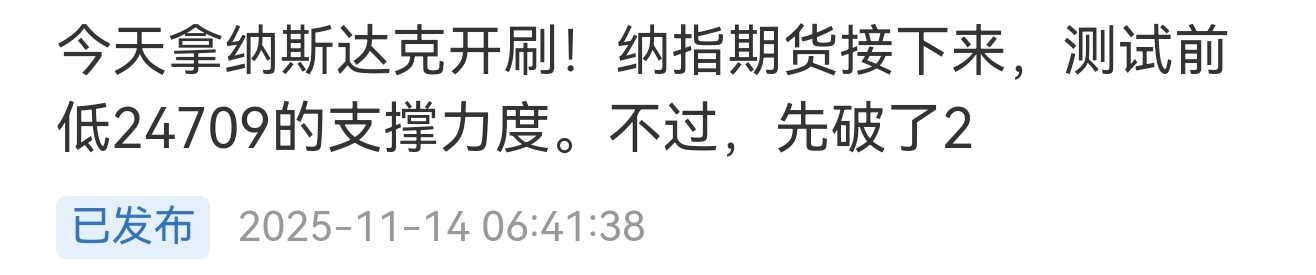 11.13日:预测纳指期货破25478,并测试前低24709的支撑力度。