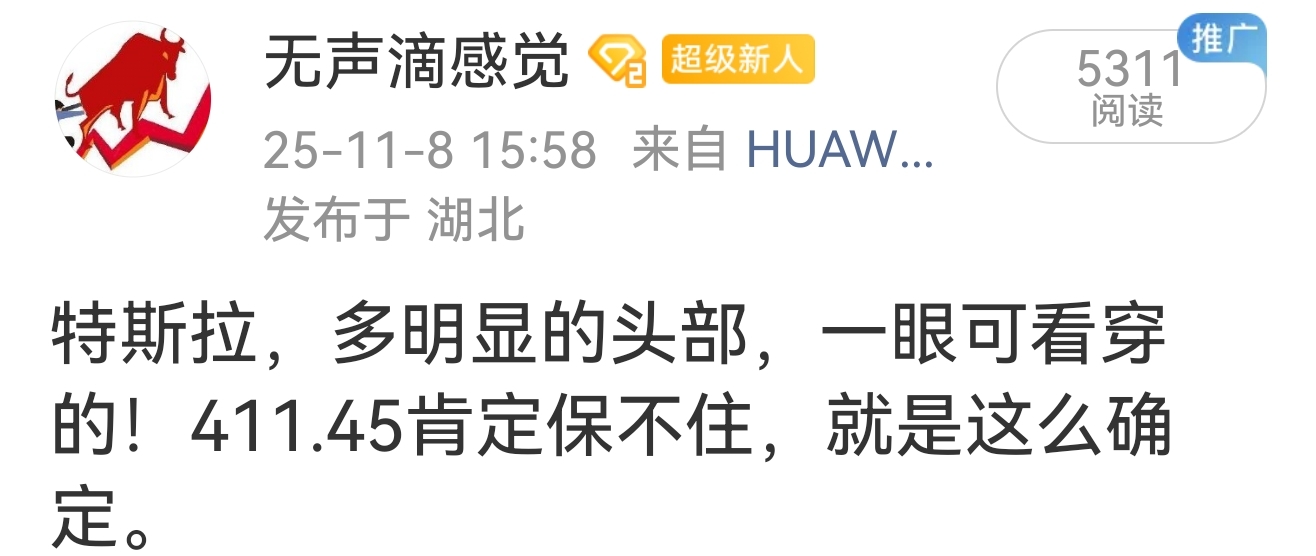 11.8日:本ID提前一周预测特斯拉将要破411.45。