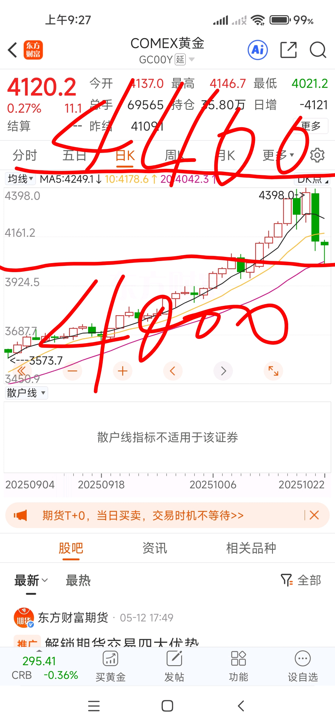 昨天的黄金暴跌,后面就4000到4400区间震荡吧。土豆说的4400是顶还是有一