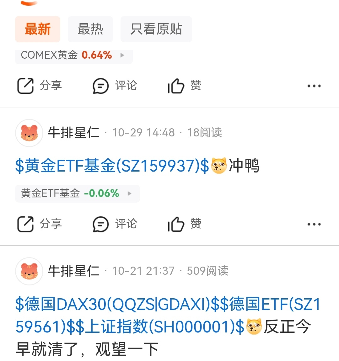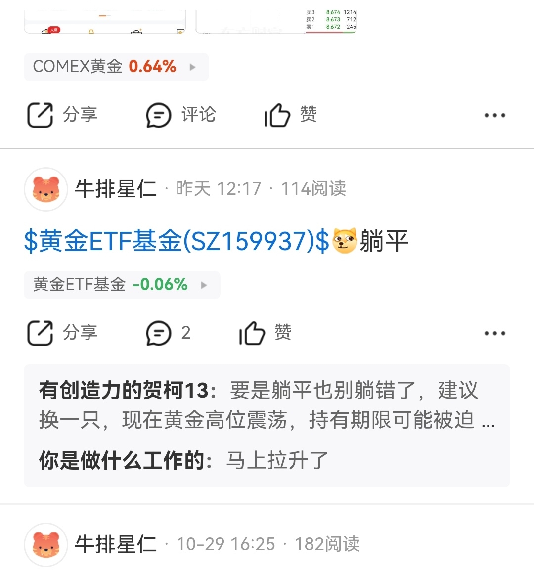 $COMEX黄金(COMEX|GC00Y)$  $黄金ETF基金(SZ159937)$  $上证指数(SH000001)$   这里那么多豆一惊一乍的,一群马后炮墙头嘈,我29号进场30开盘大绿,我只说一句“躺平”尾盘拉回来了,昨天comex黄金涨了近一个点现在又红了,感觉近期白银一直比黄金强
