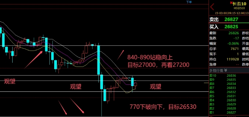 $恒生指数期货主力(HKINDEXF|HSI_M)$ 关于这一次的“停摆”事件,时隔7年,再次推动黄金大幅拉升,对于整个市场的冲击力还是很大的,明天是大A的第一天,节后的第一天,咱们不猜测市场趋势,关注一下我给的几个位置,恒指1小时级别的压力位置在26850-900区间,站稳这里看多,上方目标看到27200.下方1小时的平台支撑位置在26770一线,下破26730吧,我们看空,下方目标看到26530附近。$恒生指数(QQZS|HSI)$ #恒生指数专区#