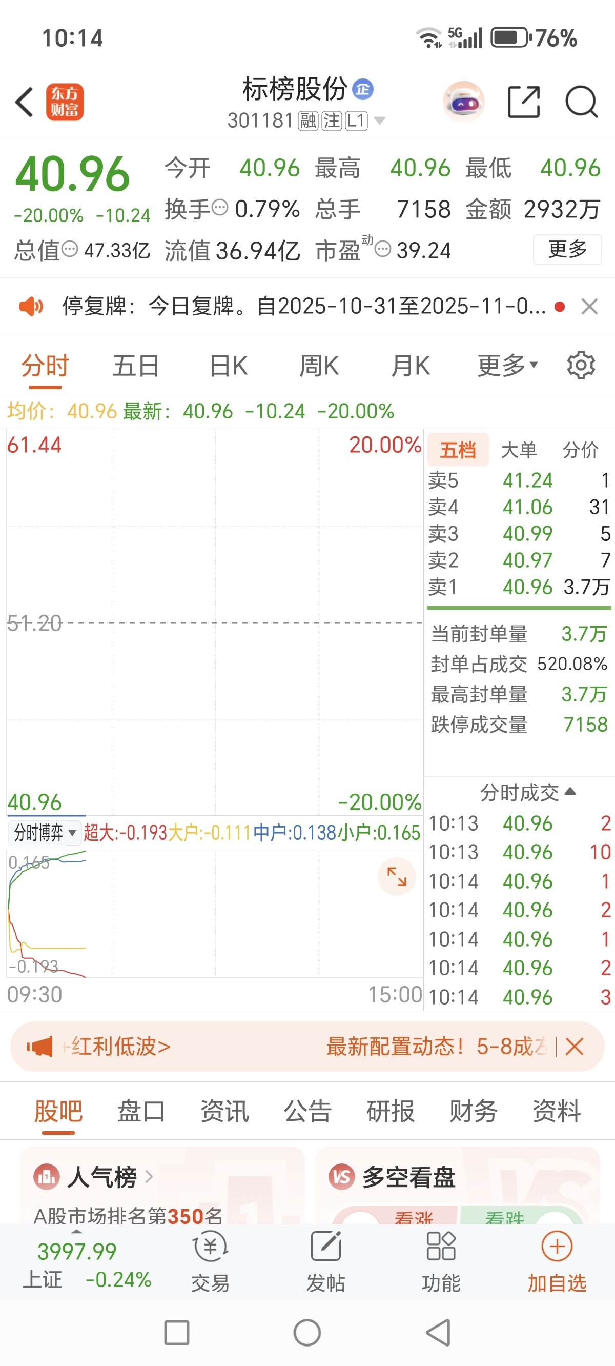 $A50期指当月连续(SGX|CN00Y)$ $上证指数(SH000001)$ $标榜股份(SZ301181)$ 我朋友想抄底,他问我能抄嘛?我该怎么回复他?