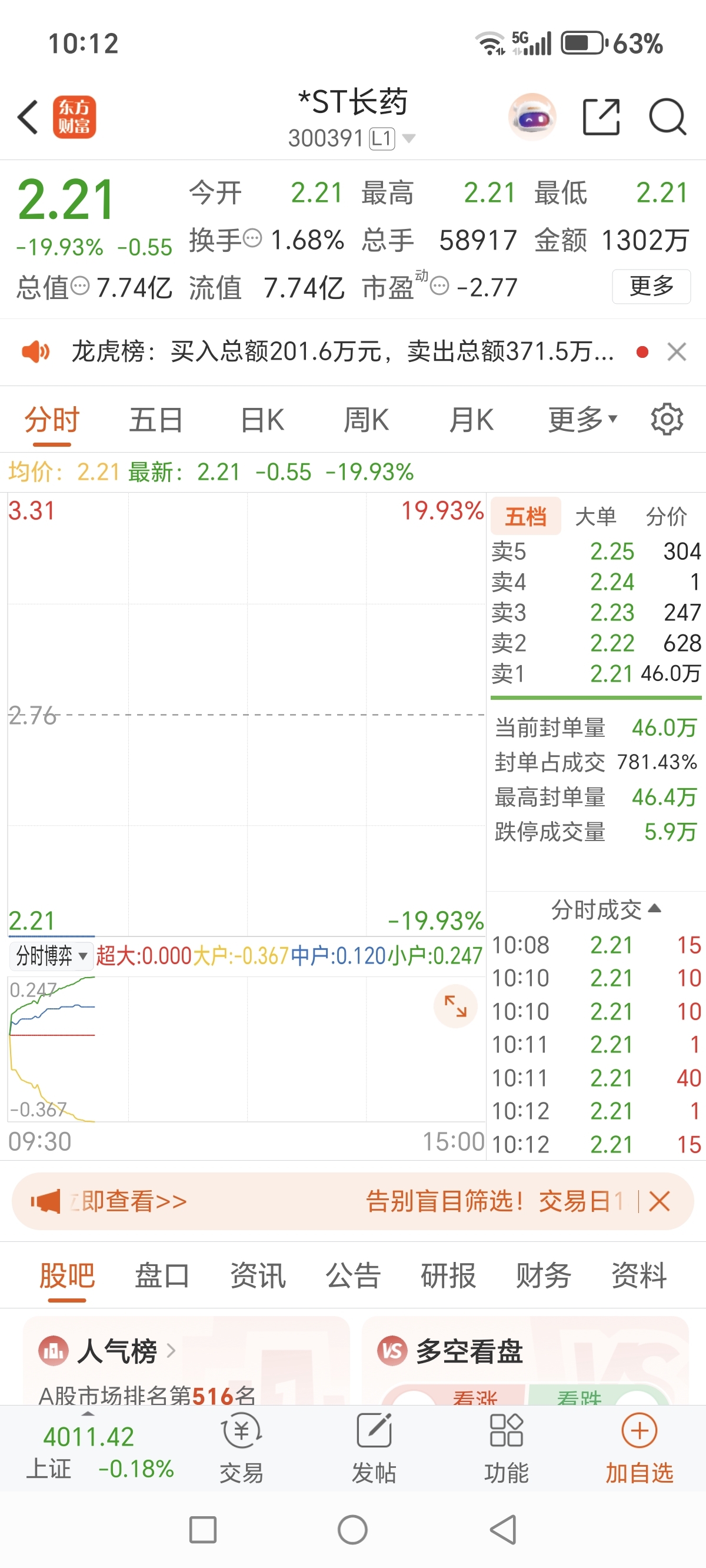 $A50期指当月连续(SGX|CN00Y)$ $上证指数(SH000001)$ $*ST长药(SZ300391)$ 我朋友想抄底,他问我能抄了嘛?我该怎么回复他?