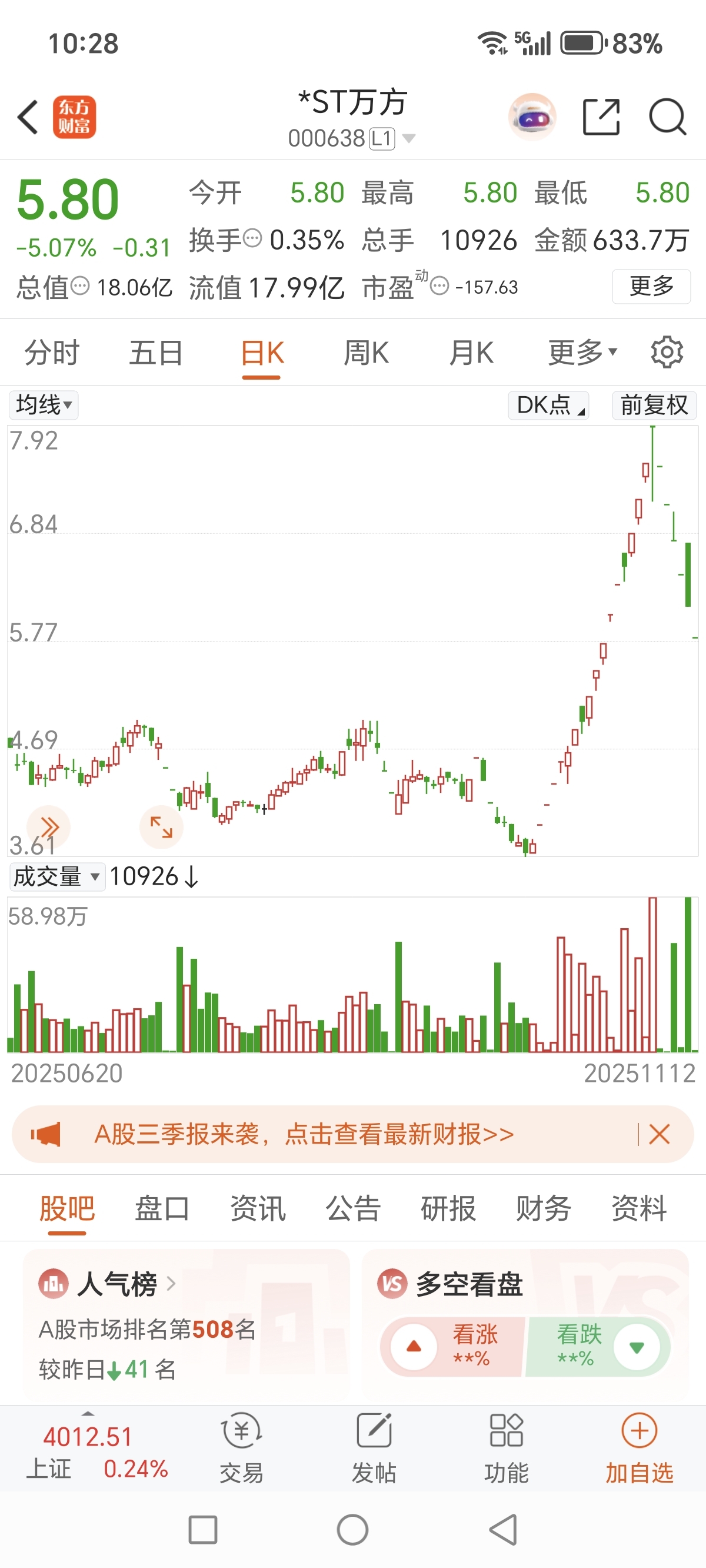 $A50期指当月连续(SGX|CN00Y)$ $上证指数(SH000001)$ $*ST万方(SZ000638)$ 我朋友想抄底,他让我帮忙问问,能抄底了嘛?