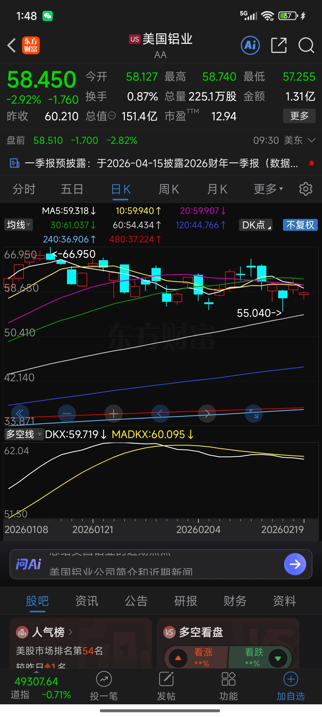$美国铝业(NYSE|AA)$ 多空线己掉头下行,,,。