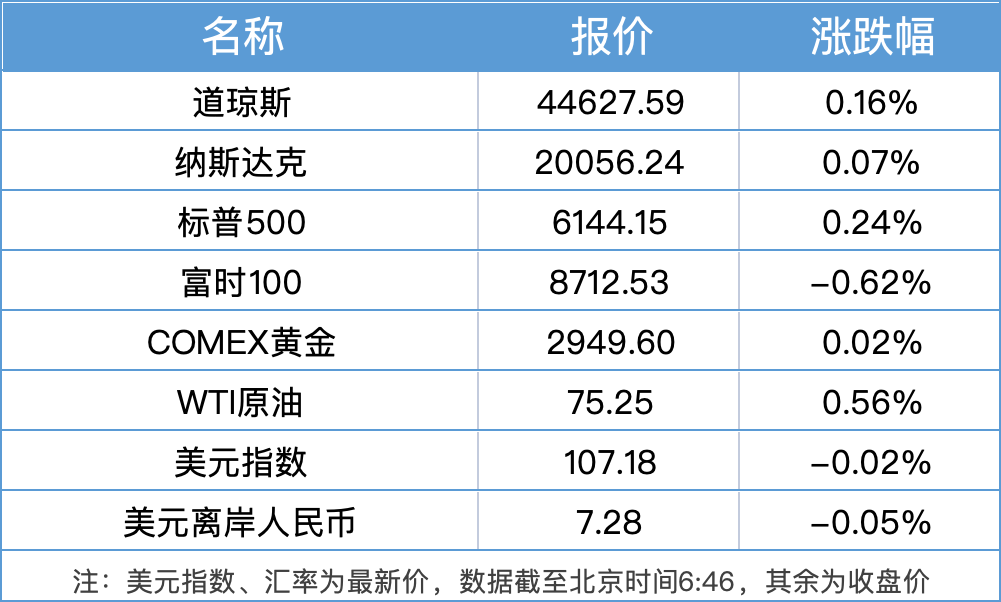 1、美股低开高走,三大指数均小幅收涨,标普500指数涨0.24%,续创历史新高;道指涨0.16%,纳指涨0.07%。中概股涨跌不一,纳斯达克中国金龙指数收跌0.38%,文远知行跌近16%。