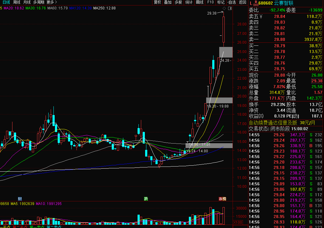 云赛智联600602:云计算大数据概念,腾讯概念股,云赛昨天低开高走,继续跟随趋势走主升浪反弹,虽然没有涨停,而且多次炸板,但上涨趋势得到确定,多头依然占据优势,没有明显的转弱,而且当前虽然涨幅偏大的情绪股有退潮迹象,但云赛没有历史高点,累计涨幅也不算大,连板次数也不多,没有前期的套捞抛压,加上阿里和腾讯的消息不断出来对云计算和大数据等需求,世道云赛继续有走强可能,今天5均线上移有合适低位看看是否还有上车点。