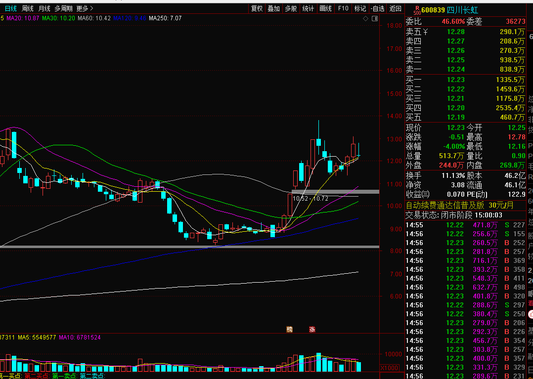 四川长虹600839:昨天受到昨日美股中概股大跌影响,昨天也是低开开盘,全天弱势震荡,收盘跌4%左右,股价一直在12的均线上方没有跌破,加上兄弟股常山走的比较强,所以有被错杀概率,先拿一下,看今天能否反包或者弱转强继续震荡反弹,不然四川冲高离场。