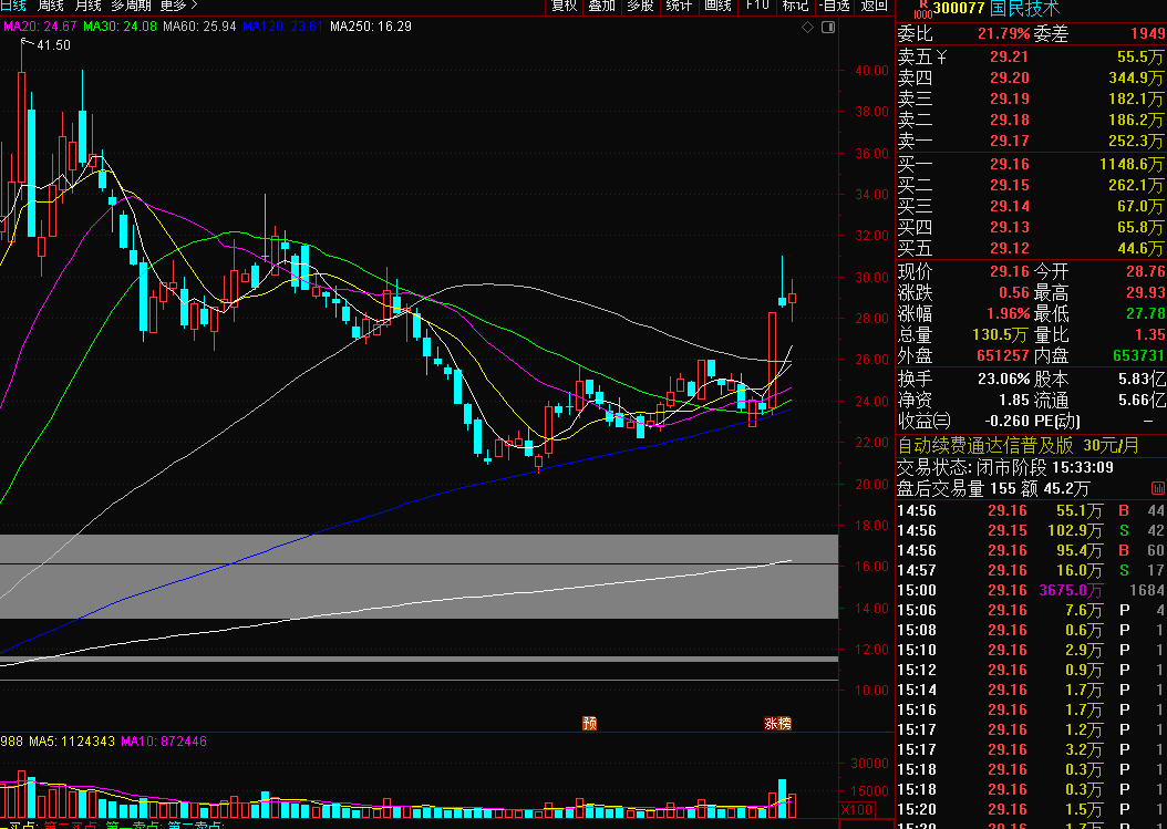 国民技术300077:国民是半导体+机器人概念,昨天机器人逆势拉升走强,国民没有很强的表现,机器人板块有继续活跃可能,结合历史行情每次行情分化,机器人都会异动托底,这次又有点相同的剧本感觉,而且当前高标股开始有退潮分化迹象,个股开始演艺高低切换,国民技术整体位置还处于低位,刚刚突破筑底22-26的震荡区间,上周五涨停后股价突破26的震荡区间上轨道压力,上涨空间打开,但因为机器人和半导体板块不强,所以没有延续爆发式拉升,而且震荡洗盘蓄力,昨天收阳线后,均线开始粘合向上多头发散,开始有攻的潜质了,今天一旦支撑上移,股价得到支撑企稳,有望加速拉升,创业板的爆发期不会太长,所以有合适的低位提前先埋着。。