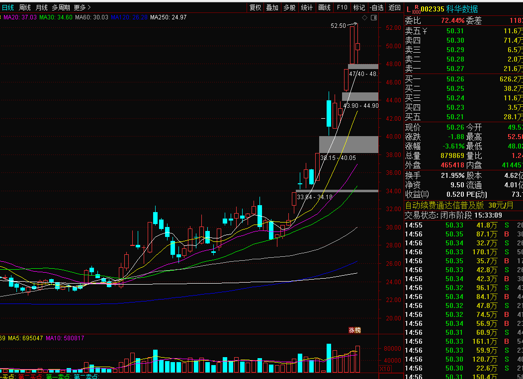 科华数据002335:该股属于云计算,很多高位股都开始分化,高低切换,但整个板块和市场依然看涨,所以切换弱势调整时间不会太久和太大幅度调整,科华低开后没有跌破下方5均线趋势支撑,而且缺口也没有填补,盘中还多次差点翻红,创出了新高,虽然收盘下跌3.6%,但趋势多头不变,今天有跟随支撑继续反包可能,先观察一天,今天不反包继续低开就离场。