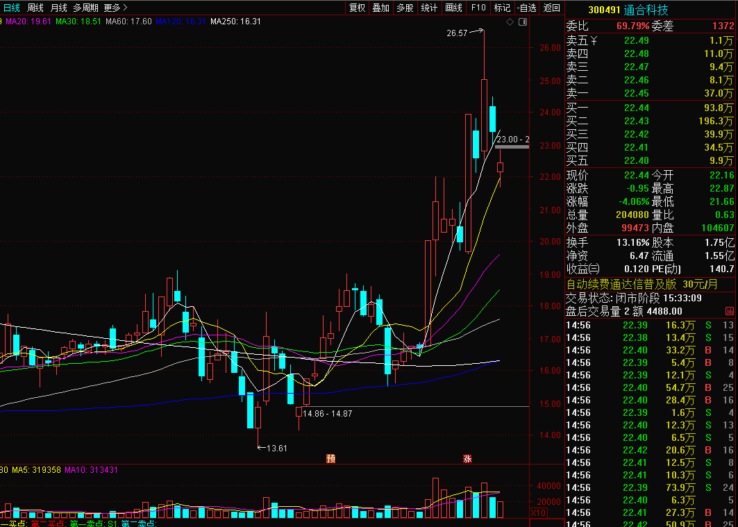 通合科技300491:昨日低开,考验10均线支撑后没有跌破,低开震荡反弹,跌幅有所缩小,收假阳线,均线依然向上排列,多头趋势不变,有向上的牵引力,不排除明天跟随趋势继续走反弹,先暂时观望一天,今天填补缺口继续反弹就拿着,如果继续创新低弱势就离场。