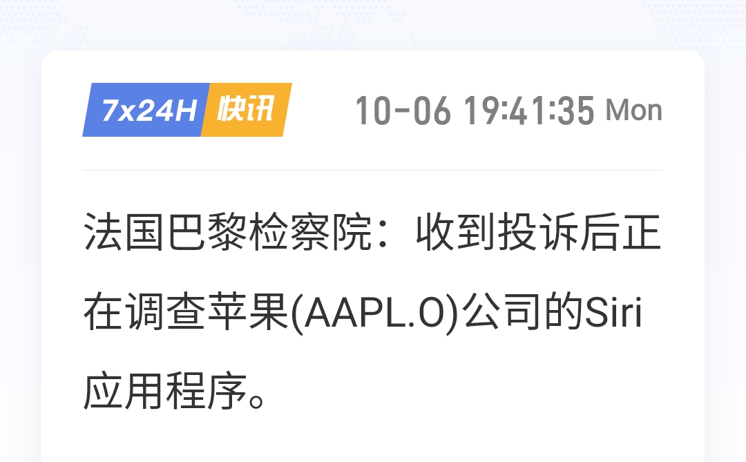 $苹果(NASDAQ|AAPL)$ 法国巴黎检察院正在调查苹果公司的Siri应用程序。