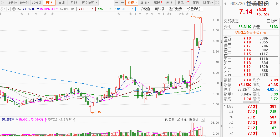 岱美股份:汽车零部件,周四平开震荡反弹,高位震荡,该股我近期反复强调5均线趋势附近先埋伏,昨天爆发后收涨5%左右,恭喜。继续格居。