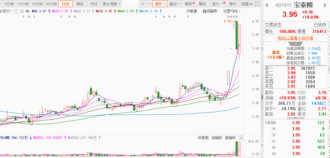 宝泰隆:煤炭,目前天气转凉,近期冷空气袭来,对煤炭需求增加,该股技术上连板断开周三调整后,周四逆势反弹涨停5天4板,上涨趋势得到加强,整体位置不算高,还有较大的拉升空间,放量拉升后,还有继续冲锋可能,今天可以逢低看看机会。