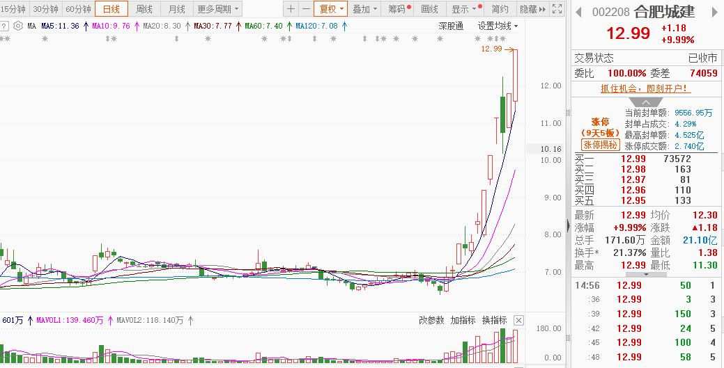 合肥城建:房地产开发+光伏,目前10天6板,今天5均线支撑企稳后直接震荡拉升,快速涨停,封单高打9500多万,早盘竞价就在留言和大家说了可以低息埋伏,恭喜吃肉,目前放量涨停,主升浪趋势延续,还有溢价空间。