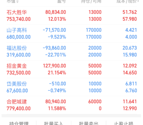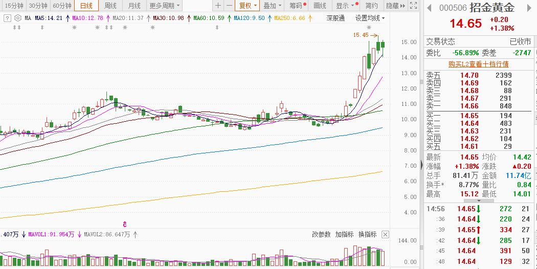 招金黄金:黄金贵金属,今天在5均线附近支撑拉升,收涨1%左右,均线依然向上运行,还有继续拉升预期,先等等,看周一力度再说。