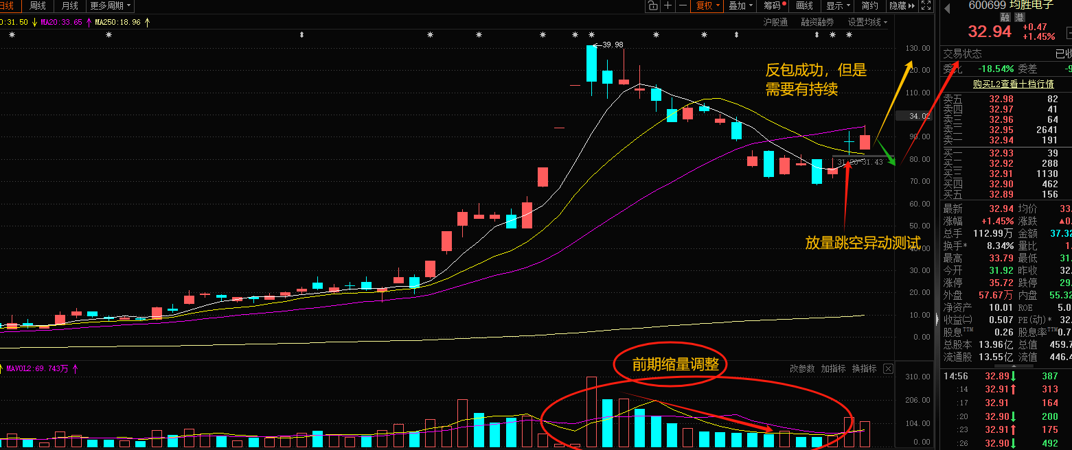 均胜电子600699:智能驾驶以及机器人概念,如图,因为前面已经完成了缩量调整洗筹。前天也做了异动测试,并且昨天还算强并没有补缺口,那么今天就比较关键,如果继续反弹站上上方均线,那么短期就大概率一波可以震荡到新高,否则短期有回踩支撑的可能。不过向下已经没有空间了。所以调整也会是缩量调的。只会拖时间。
