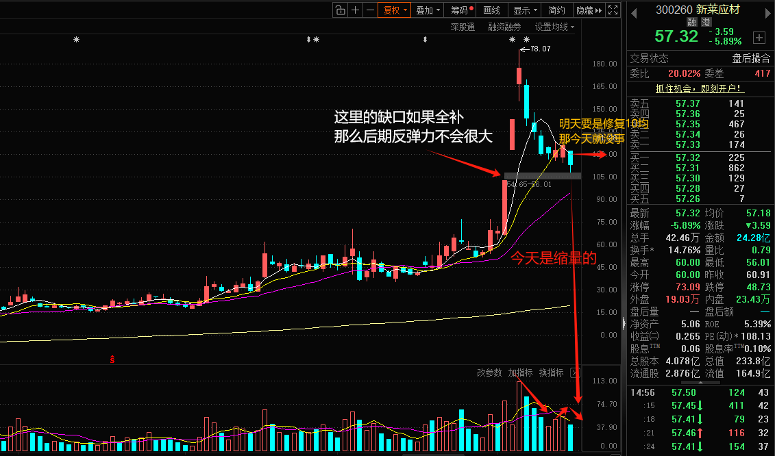 新莱应材300260:新凯莱概念,早上低开之后直接往下压,并且破了10均线,短期看似破位了,但是今天一整天都没放量,所以还是可以i多看一天的。唯一需要担心的是会去完全补缺口也就是碰54.65这个位置,如果这样的话,那么后期反弹的力度和预期就会降低。